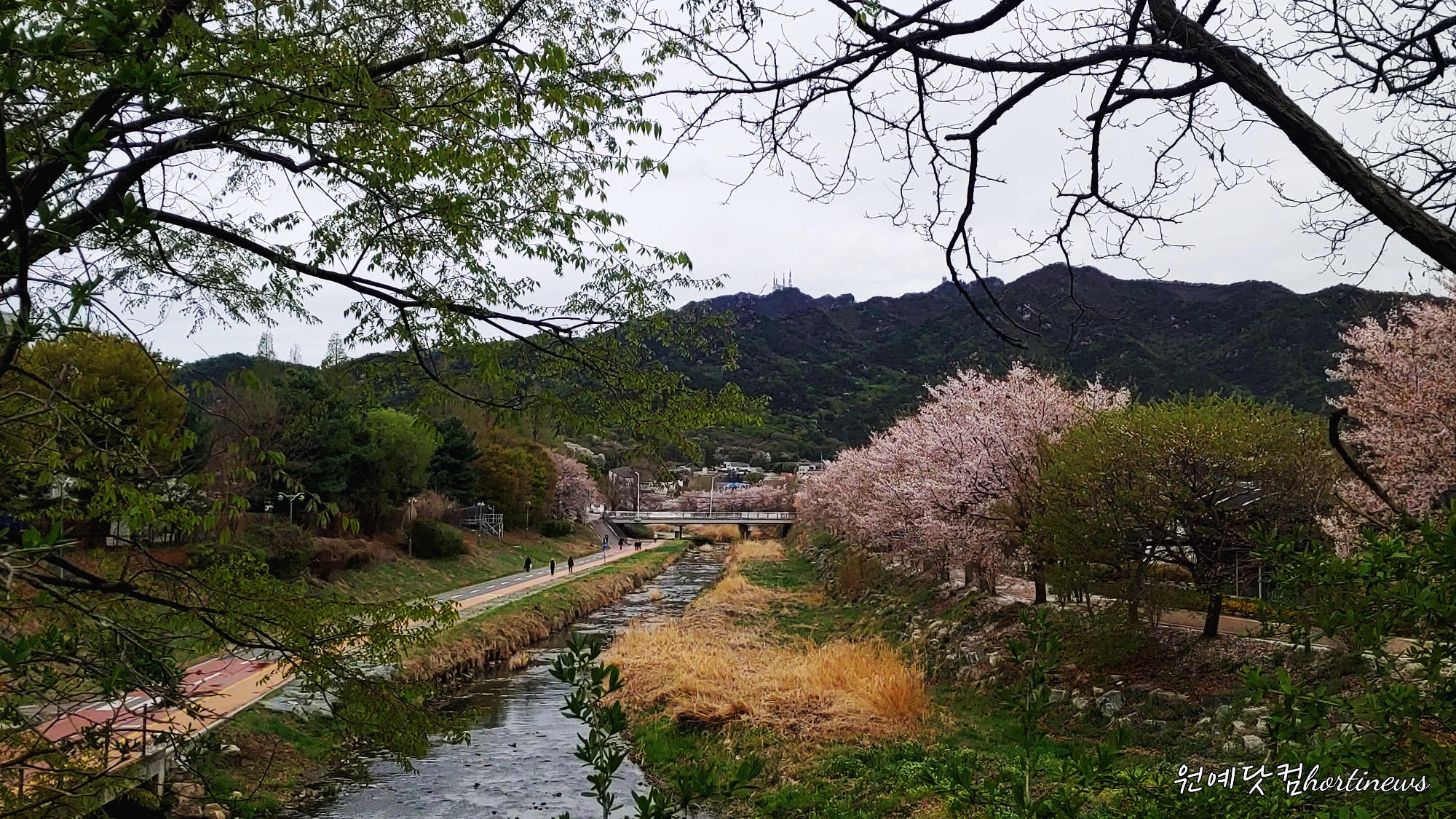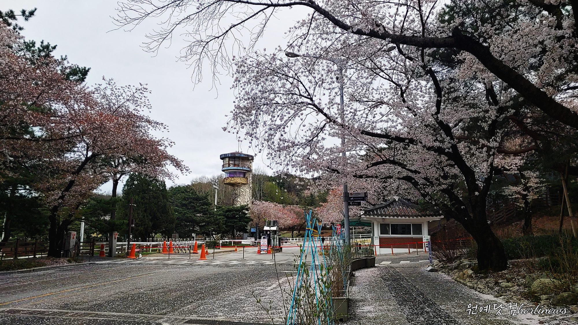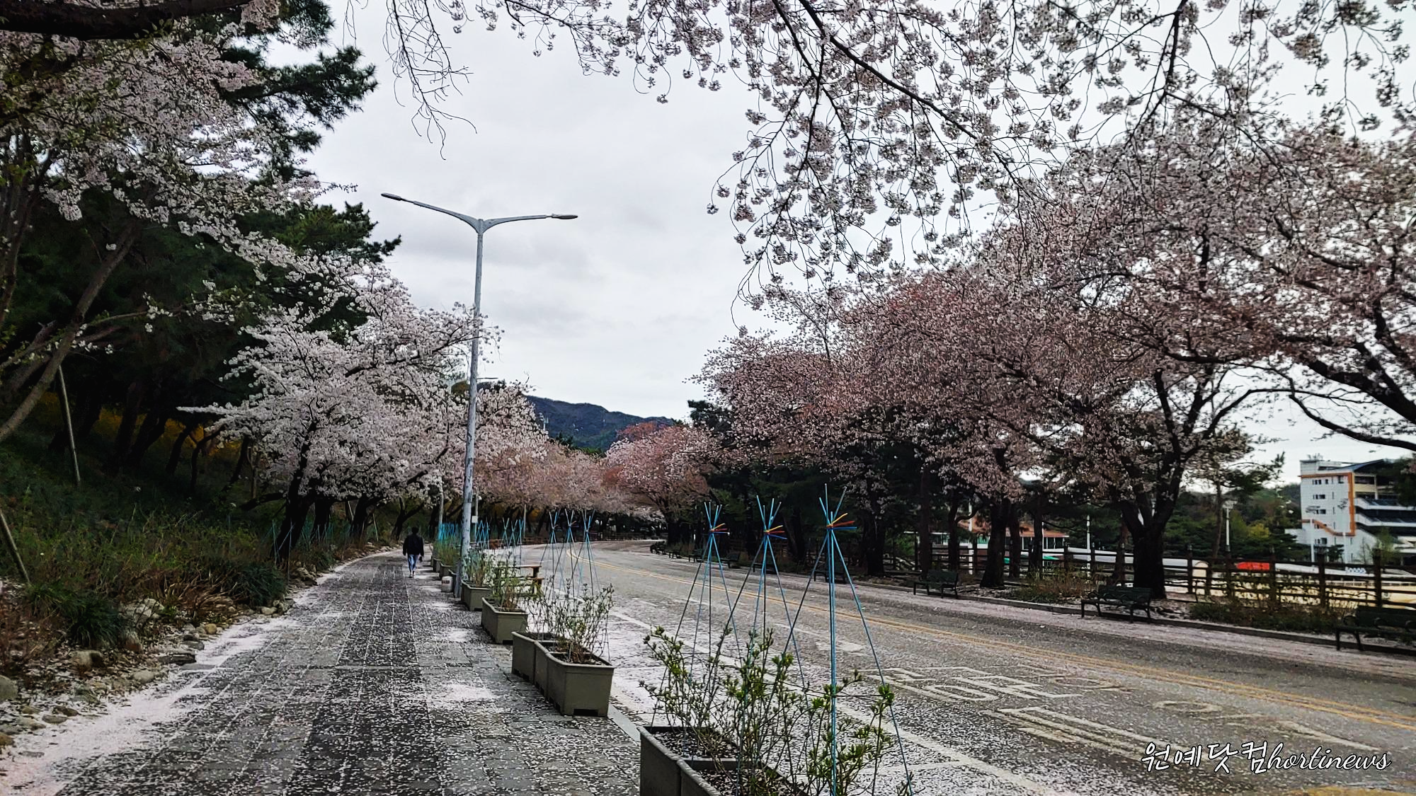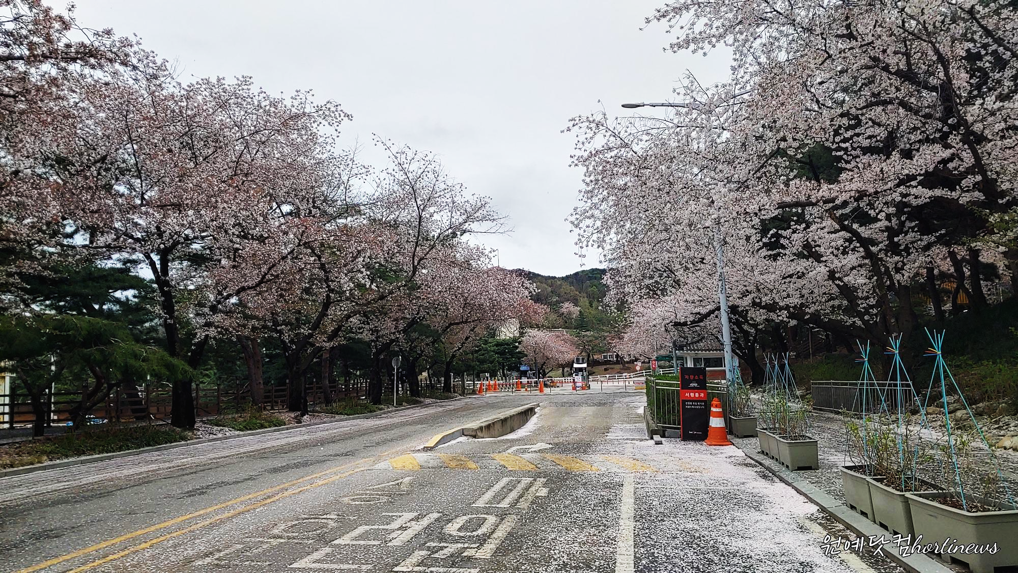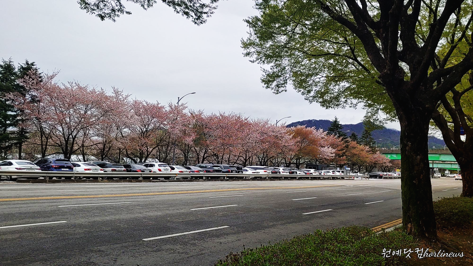 지난 주말 어제까지 만에도 약간의 무덥고 따뜻한 봄날에 가로수 벚꽃이 만발하게 아름답게 피어있었다.
