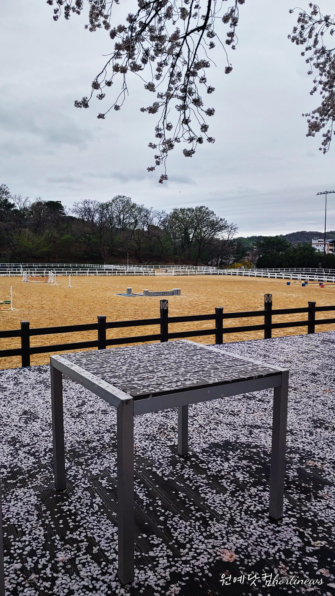 과천 경마장가는길가에 봄비가 축축이 쌓이는 꽃과 잎이 무게에 견디지 못하고 쌀쌀한 바람에 휘날려 꽃눈이 내리고 있었다.